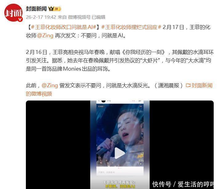 争议发酵后,化妆师Zing的回应堪称“谜语人”典范。他先是在17日凌晨发文“不要问,问就是大水滴反光”,试图将眉形的视觉争议归因于耳环的反光效果。然而,同日内他又突然“改口”,发布了那条著名的“不要问,问就是AI”,以极具戏谑和超现实的方式终结了对话。这并非Zing首次如此应对,早在2025年春晚“虾片耳环”争议时,他就展现过类似的幽默防御姿态。