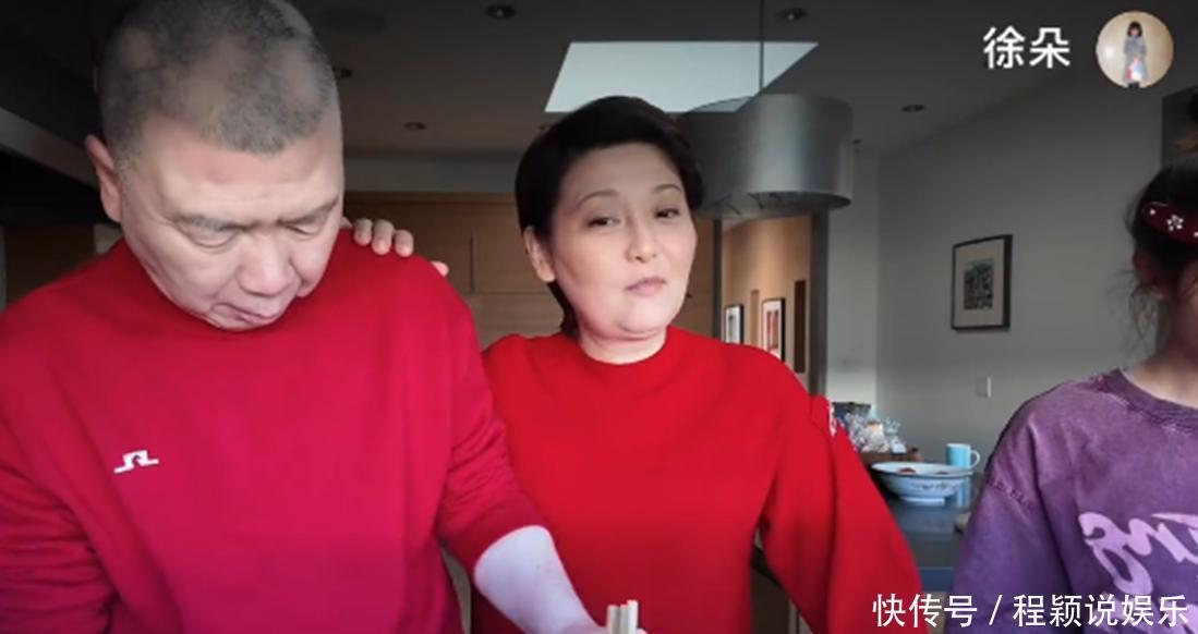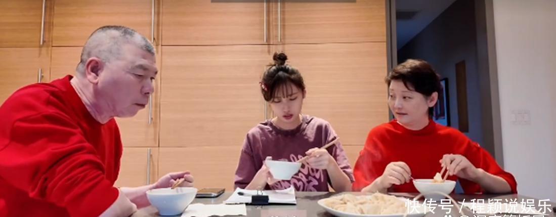 镜头里又进来一个人。是徐帆。她也穿着红衣服。她没去碰那些馅料。就站在丈夫和女儿后头。手里举着手机。她在笑。对着那两个人拍。徐帆的声音传出来。她说家里包饺子这事。全归她丈夫管。她自己一点都不会。女儿徐朵马上接话。她说爸爸才是今天要拍的重点。冯小刚听见了。他手里还在搅和馅。搅得更用力了些。脸上笑得更开了些。徐帆旁边还站着个人。是个阿姨。在弄别的东西。