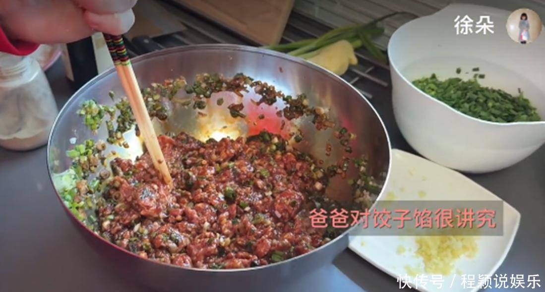 徐朵靠到冯小刚那儿。她站好了。她问饺子馅里都有啥东西。冯小刚手里没停。筷子还在搅肉馅。他告诉女儿,这是猪肉。往里加了点水。他说这样肉会嫩些。放了酱油。放了盐和糖。还有胡椒粉。葱姜也切碎了放进去。他说馅得搅到有劲儿。搅到表面看着油亮才行。盆里的肉馅颜色挺红的。泛着油光。徐朵听完说了一句。她说爸你弄这个馅可真仔细。说完她拿起手机。对着那盆馅拍了几下。也拍了她爸的侧脸。