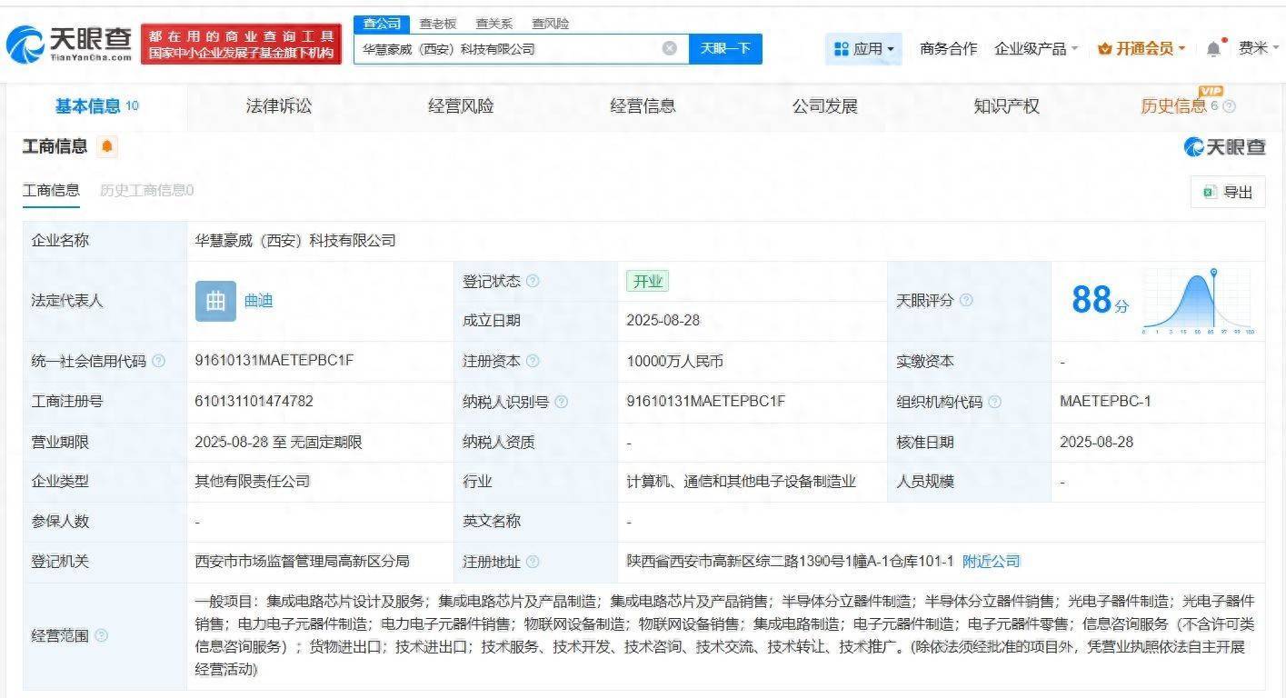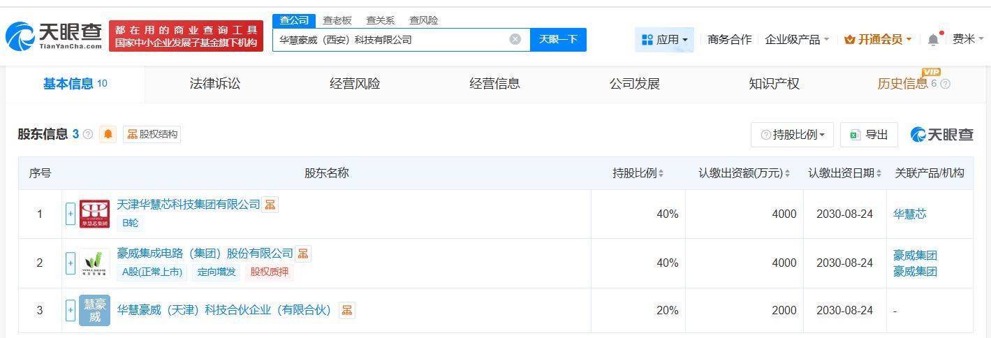 天眼查工商信息显示,近日,华慧豪威(西安)科技有限公司成立,法定代表人为曲迪全国前三股票配资,注册资本1亿人民币,经营范围包括集成电路芯片设计及服务、集成电路芯片及产品制造、集成电路芯片及产品销售等。股东信息显示,该公司由豪威集团(603501)、 天津华慧芯科技集团有限公司、华慧豪威(天津)科技合伙企业(有限合伙)共同持股。