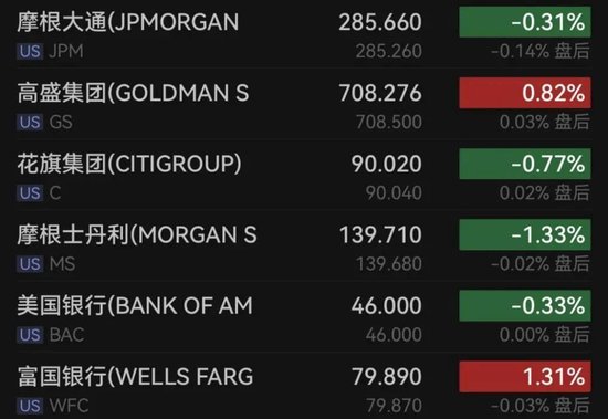银行股多数下跌,摩根士丹利跌超1%,花旗跌0.77%,美国银行跌0.33%,摩根大通跌0.31%,高盛涨0.82%,富国银行涨逾1%。