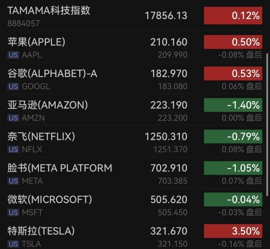 大型科技股涨跌不一,特斯拉涨超3%,谷歌涨0.53%,苹果涨0.5%,英伟达涨0.39%,微软跌0.04%,脸书跌逾1%,亚马逊跌超1%。