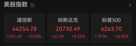 截至收盘,道指涨0.53%,报44254.78点;纳指涨0.25%,报20730.49点;标普500指数涨0.32%,报6263.70点。