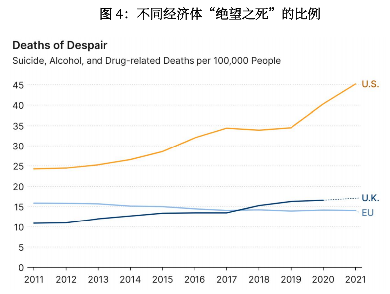 布鲁金斯学会的报告[35]将绝望定义为:对自己是否活着感到无所谓。处于绝望状态的人不相信自己能够采取任何行动来改善自身处境。缺乏对未来的目标感和叙事感,会使绝望中的人容易受到阴谋论、假新闻和极端主义活动的影响。经济学家Case和Deaton在2015年提出“绝望之死”的概念,“绝望之死”涵盖了药物过量、自杀和酒精性肝病三类死亡。疫情后,美国“绝望之死”的比例急剧上升并持续维持在高位,而欧盟则基本保持平稳。