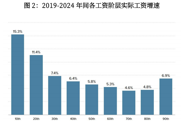 根据美国经济政策研究所(Economic Policy Institute)的研究[2],低收入群体的工资在2024年前曾出现高速增长。2019年至2024年间,低收入工人的实际工资增长速度(经通胀调整后)创历史新高,且与其他所有收入阶层的工人相比,其工资增长最为强劲(如图2所示)。