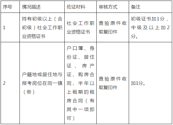 ①持有社会工作职业资格证书,其中持初级证书加1分,持中级及以上证书加2分。