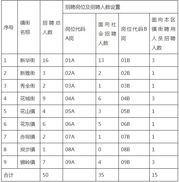 本次公开招聘社区专职工作人员设A、B两类岗位,分别是社会招聘(A岗)、定向专项招聘(B岗)。各岗位具体招聘人数详见《广州市花都区2025年公开招聘社区专职工作人员职位表》(附件1)。