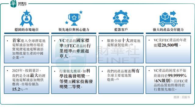 根据灼识咨询,自2005年起,华盛锂电在大多数年度中,按销量计,一直是全球最大的锂电池电解液添加剂供应商。于2025年,按销量计,公司是全球最大的锂电池电解液添加剂供应商,市场份额为15.2%。